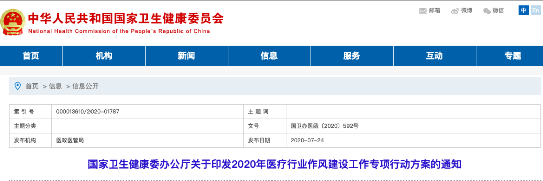 今日(7月24日)下午,國家衛(wèi)健委辦公廳發(fā)布《關(guān)于印發(fā)2020年醫(yī)療行業(yè)作風(fēng)建設(shè)工作專項(xiàng)行動方案的通知》(以下簡稱《通知》)。