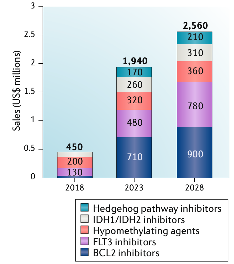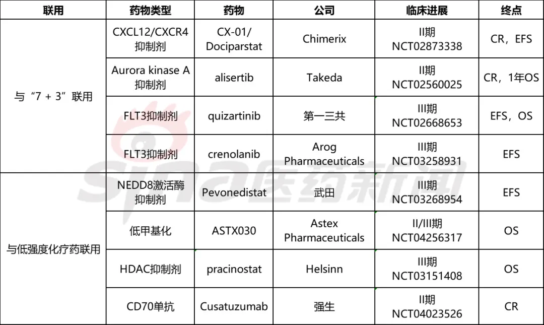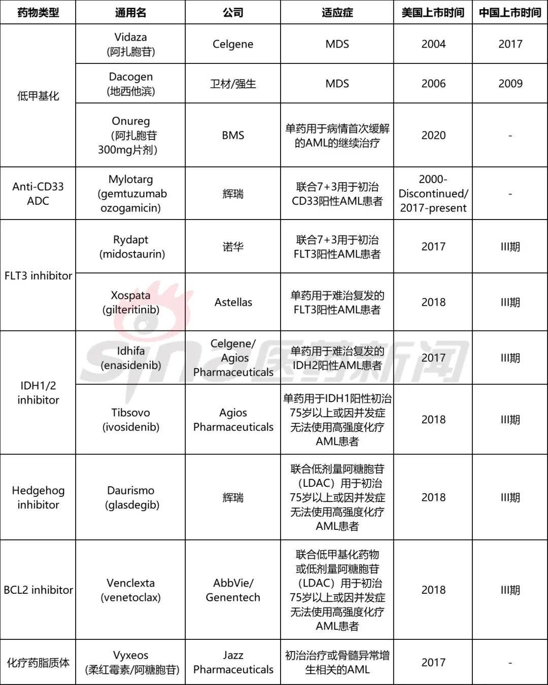 從近5年AML新藥在美國獲批的情況,也可以看出AML新藥臨床開發(fā)的趨勢主要有三類。