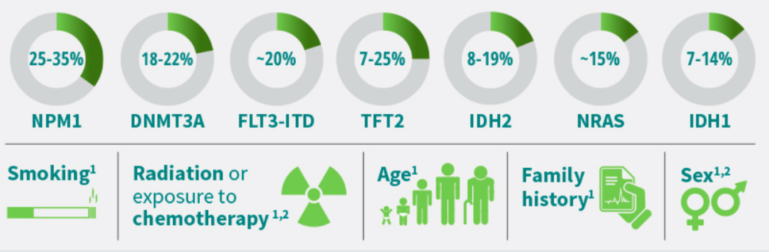 盡管AML發(fā)病機制未明,但隨著分子學分型的發(fā)展,目前認為分子的突變會通過兩種機制來促成白血病的發(fā)生。一種是激活信號轉導通路的分子改變,從而影響造血細胞的生存、增殖和分化,這就包括Ⅲ型受體酪氨酸激酶FLT3或RAS家族成員;另一種是影響轉錄因子或轉錄共激活復合物成分,表觀遺傳調控,導致造血細胞分化受損,這就包括CCAAT/增強子結合蛋白α基因(CEBPA),核磷蛋白基因(NPM1)和參與多種代謝和表觀遺傳細胞過程的異檸檬酸脫氫酶(IDH)。