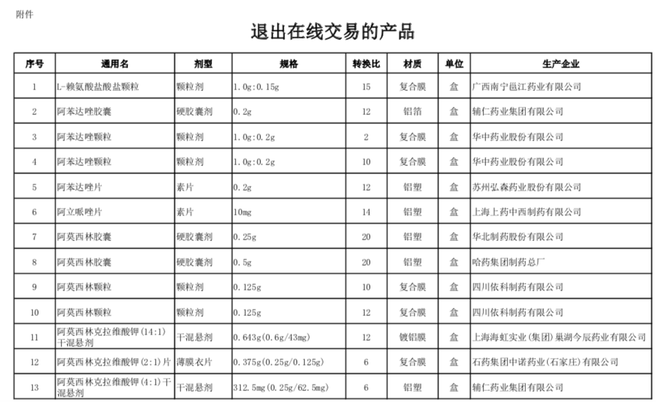 據(jù)賽柏藍梳理,退出在線交易的產(chǎn)品共1350個,涉及阿莫西林膠囊、阿奇霉素膠囊、阿司匹林片、安乃近片、八珍益母丸、板藍根顆粒、布洛芬片、丹參注射液、法莫替丁片等常見藥品。