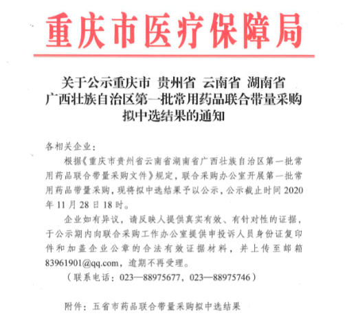 賽柏藍將擬中選結(jié)果與五省市正式集采方案納入的17個藥品名單對比后發(fā)現(xiàn),丙戊酸鈉、奈達鉑兩品種沒有企業(yè)中選。據(jù)梳理,本次擬中選的藥企分為第一和第二質(zhì)量層次,共涉及珠海聯(lián)邦制藥、瑞陽制藥、重慶科瑞制藥、江蘇奧賽康藥業(yè)、揚子江藥業(yè)、東北制藥集團沈陽第一制藥、上海景峰制藥、國藥控股分銷中心、浙江仙琚制藥、正大天晴藥業(yè)集團、江蘇豪森藥業(yè)集團等。根據(jù)官方信息,此次集采藥品價格平均降幅達54.20%,最高降幅為83.54%。以注射用替加環(huán)素為例,后續(xù)患者使用一支注射用替加環(huán)素,可節(jié)省約113.16元。按照約定采購量計算,五省區(qū)市一年可節(jié)省約12.65億元,重慶市一年可節(jié)省約5.06億元。根據(jù)五省市發(fā)布的擬中選結(jié)果通知,本次擬中選結(jié)果公示截止時間為昨日(11月28日)18時,也就是說,隨著公示的到期,本次中選的正式結(jié)果將于不久后出爐。根據(jù)五省市集采方案的規(guī)定,藥企在中選后放棄中選資格可能會被視為違規(guī)。不難看出,上述中選結(jié)果大概率不會出現(xiàn)變動。