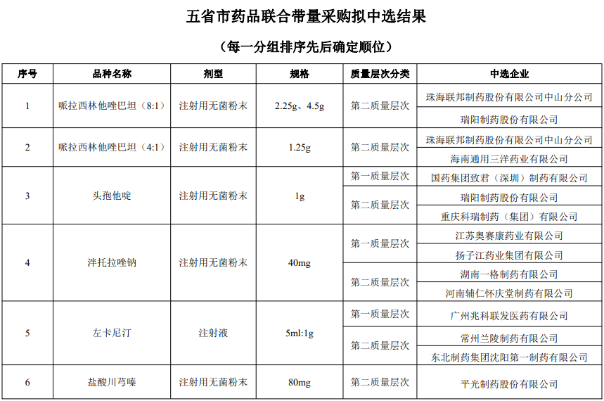 其中,哌拉西林鈉他唑巴坦(8:1)、哌拉西林鈉他唑巴坦(4:1)、頭孢他啶、鹽酸川芎嗪、奧硝唑氯化鈉、美洛西林、頭孢噻肟、丙戊酸鈉、替加環(huán)素約定采購量計算基數(shù),以2019年1月1日至2019年12月31日醫(yī)療機構(gòu)上報采購需求量的60%累加確定。值得注意的是,本次集中帶量采購藥品品種分為第一質(zhì)量層次和第二質(zhì)量層次。第一質(zhì)量層次:專利藥、原研藥品、參比制劑、通過質(zhì)量和療效一致性評價的仿制藥品、化學藥品新注冊分類批準藥品和納入《中國上市藥品目錄集》的藥品、獲得歐盟CGMP、英國MHRA、美國FDA、日本JGMP認證證書并出口歐、英、美、日主流市場的國產(chǎn)藥品。第二質(zhì)量層次:除第一質(zhì)量層次外的其他進口藥品和國產(chǎn)仿制藥。聯(lián)合采購地區(qū)各品種采購量按照以下原則進行分配:實際中選企業(yè)為1家的,產(chǎn)品采購量不少于該質(zhì)量層次約定采購量計算基數(shù)的100%;同質(zhì)量層次實際中選企業(yè)為2家的,從第一順位企業(yè)交替選擇,每個擬中選企業(yè)每次選擇1個地區(qū)(市、州、盟),重復上述過程,直至所有地區(qū)(市、州、盟)選擇確認完畢。如同通用名藥品其中一個質(zhì)量層次無中選藥品,該質(zhì)量層次約定采購量的50%劃分到另一質(zhì)量層次。根據(jù)上述規(guī)定,單家企業(yè)中選的,無疑將獲得更多的采購量。此外,方案還進一步規(guī)定,非中選產(chǎn)品和未納入帶量采購同通用名同給藥途徑的產(chǎn)品全部納入監(jiān)控管理,其采購量原則上不得高于上一年度歷史采購量,不得超過中選藥品采購數(shù)量。按照上述規(guī)定,中選藥企與非中選藥品的采購量,將出現(xiàn)明顯的分化。
