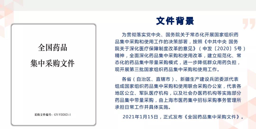 今日(1月25日),國(guó)家聯(lián)采辦再次發(fā)文,為做好集采解讀工作,企業(yè)可登陸“國(guó)家組織藥品集中采購(gòu)綜合服務(wù)平臺(tái)”,下載《全國(guó)藥品集中采購(gòu)文件要點(diǎn)解讀》進(jìn)行學(xué)習(xí)。網(wǎng)址為:http://pub.smpaa.cn/xxsj。