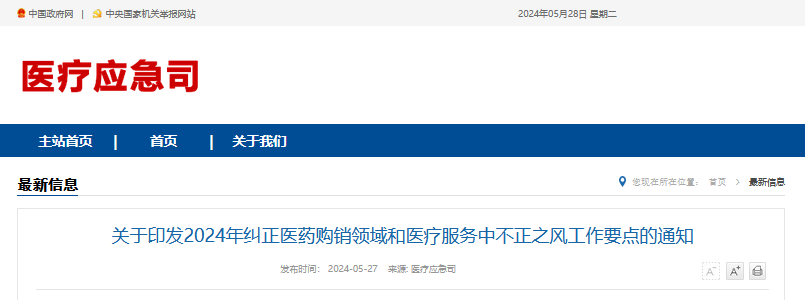 5月27日,國家衛(wèi)健委等14部門發(fā)布《關(guān)于印發(fā)2024年糾正醫(yī)藥購銷領(lǐng)域和醫(yī)療服務(wù)中不正之風(fēng)工作要點(diǎn)的通知》提到,落實(shí)辦醫(yī)主體責(zé)任,開展大型醫(yī)院巡查工作。