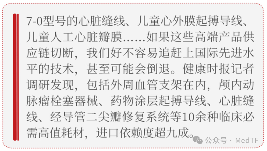 這僅僅是高值耗材國(guó)產(chǎn)替代“卡脖子”的冰山一角。健康時(shí)報(bào)記者調(diào)研發(fā)現(xiàn),顱內(nèi)動(dòng)脈瘤栓塞器械、藥物涂層起搏導(dǎo)線、心臟縫線、經(jīng)導(dǎo)管二尖瓣修復(fù)系統(tǒng)、人工血管、ECMO(體外膜肺氧合)耗材等10余種臨床必需高值耗材,進(jìn)口依賴度超九成。